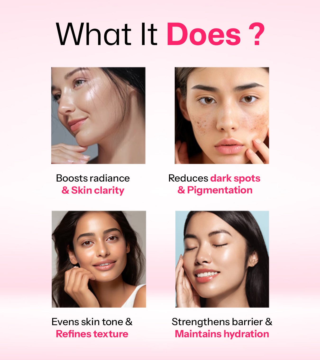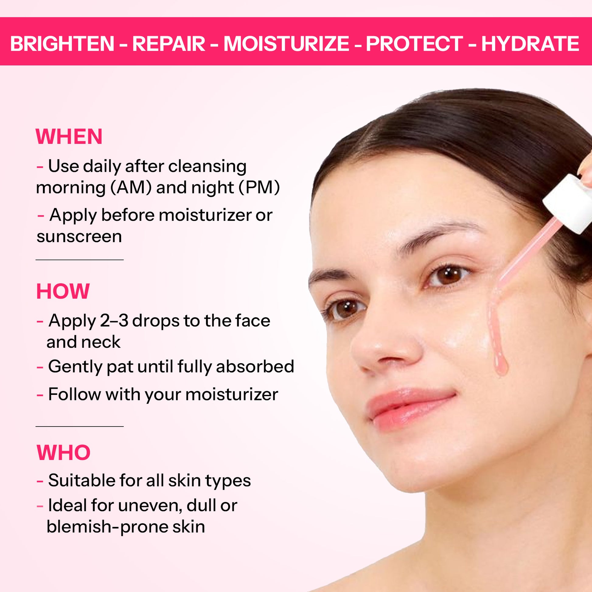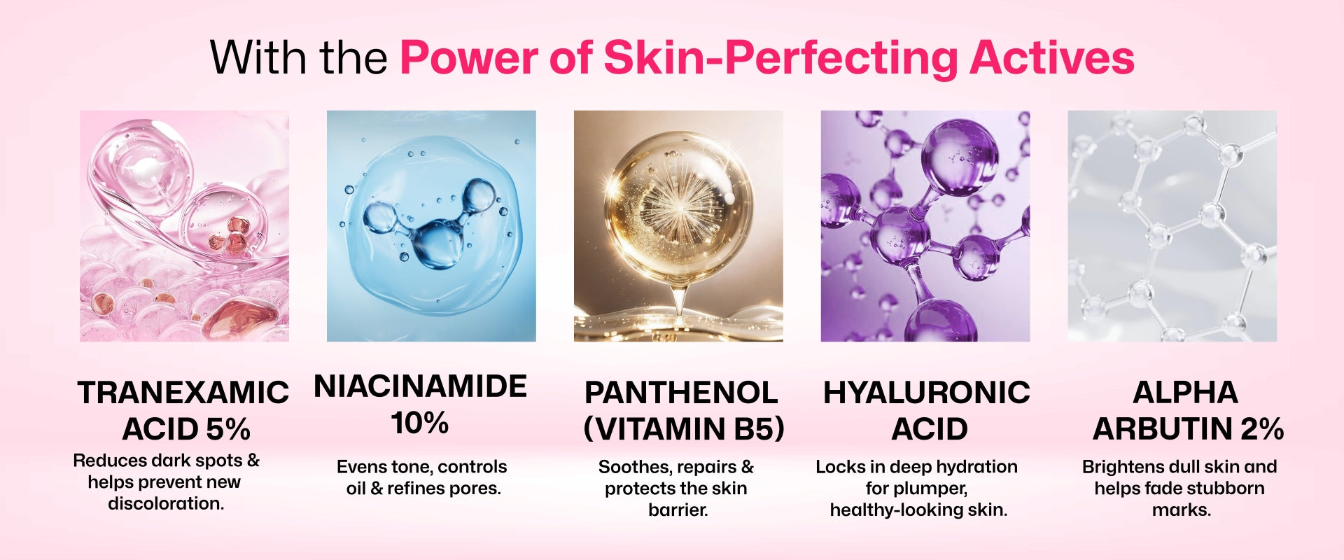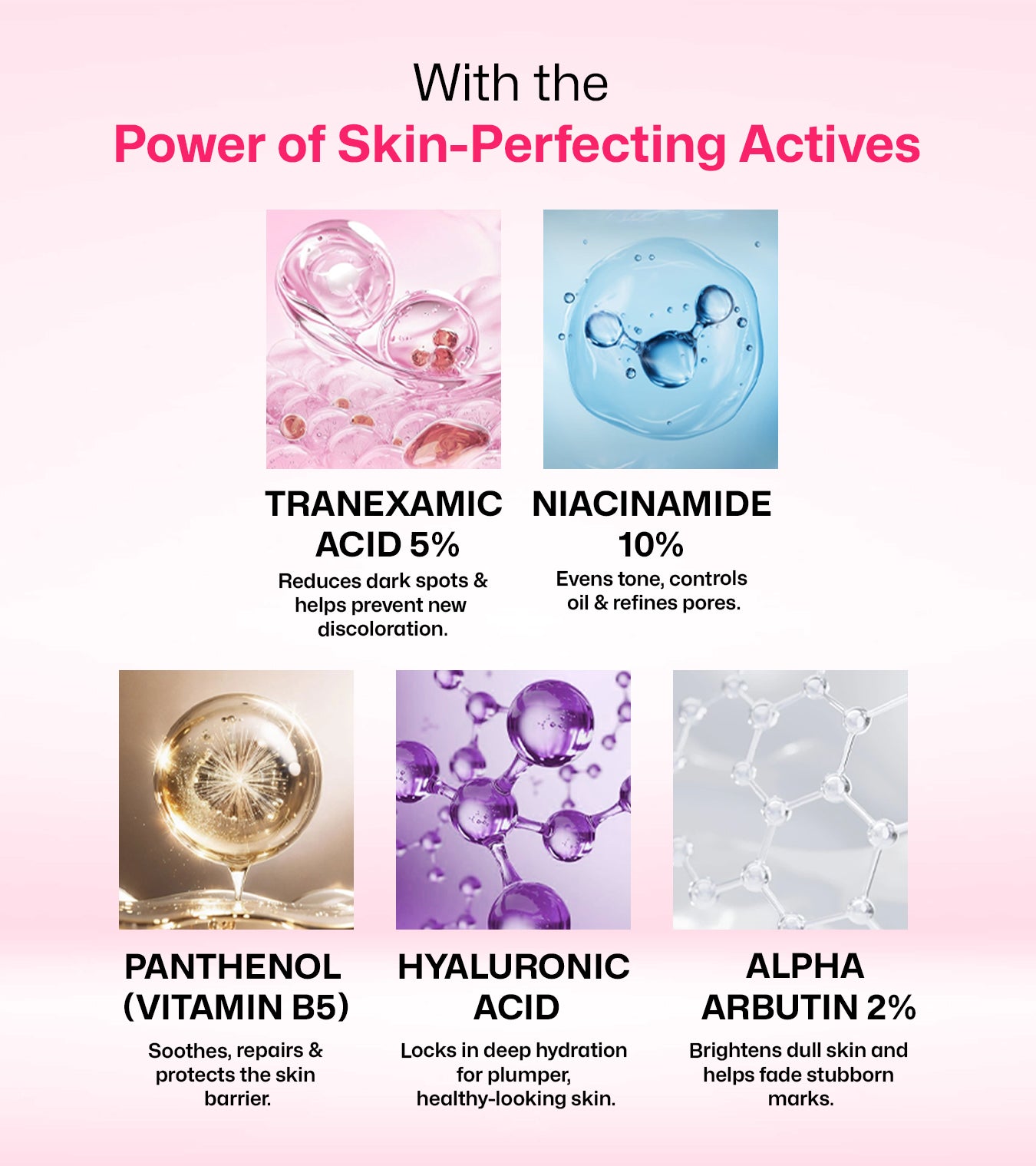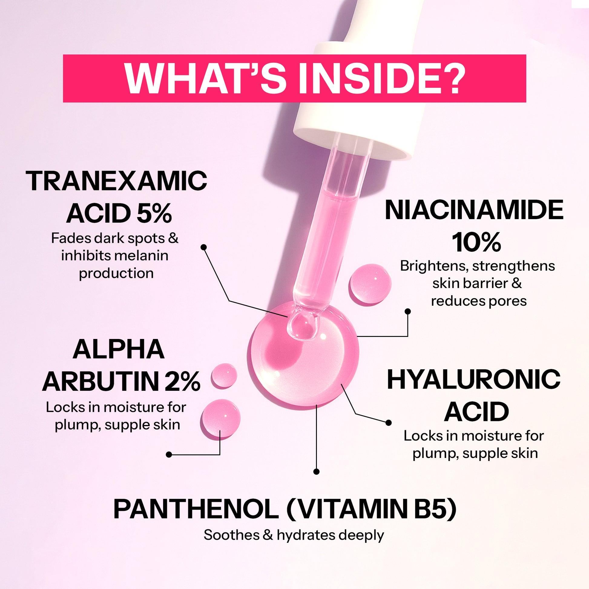 This powerful serum is formulated with Tranexamic Acid 5% and Niacinamide 10% to reduce dark spots, melasma, and hyperpigmentation while enhancing overall skin radiance. Enriched with Panthenol (Vitamin B5), Hyaluronic Acid, and Alpha Arbutin 2% for deep hydration and a smooth, even-toned glow.