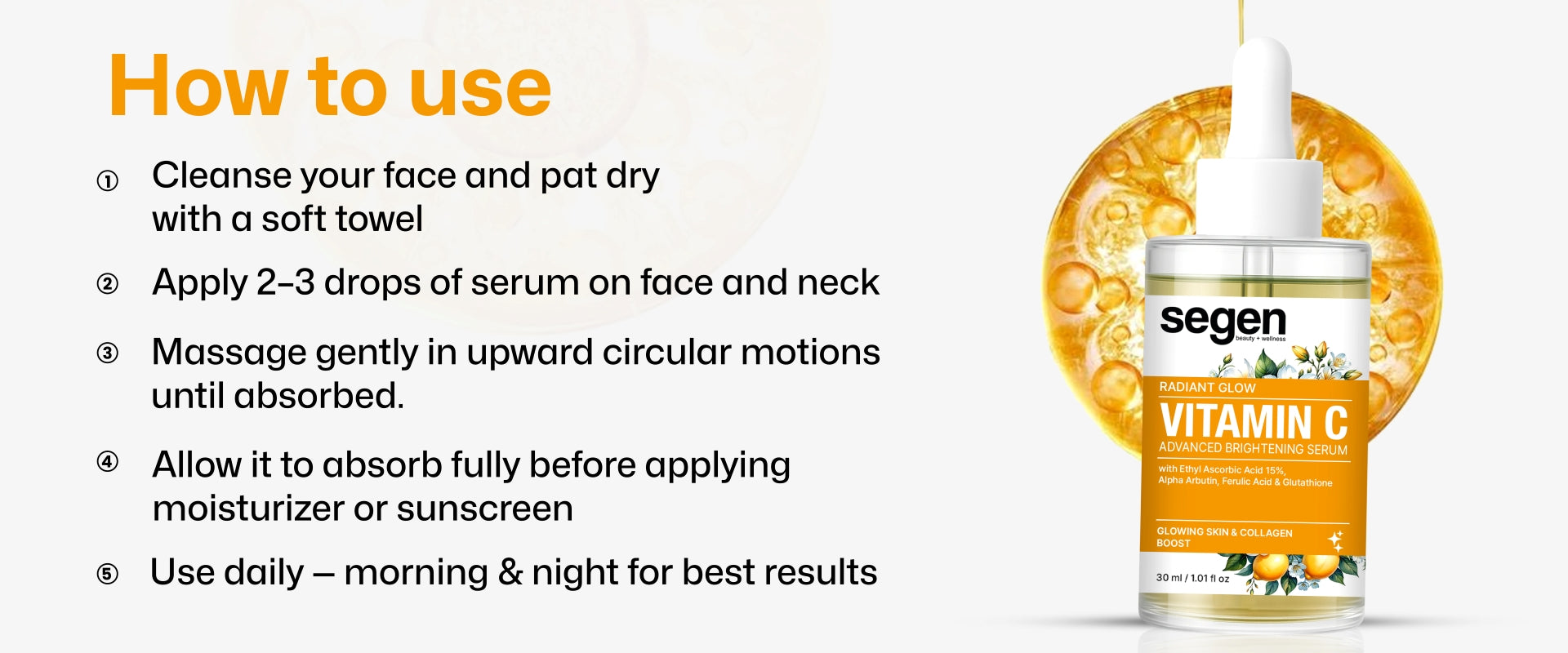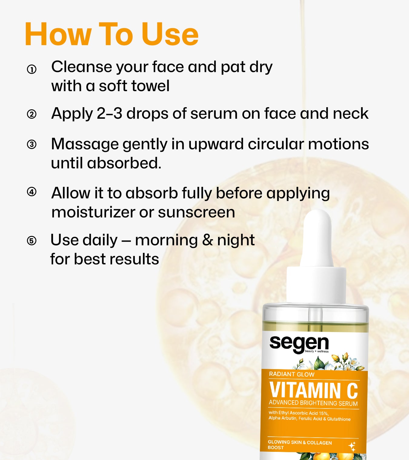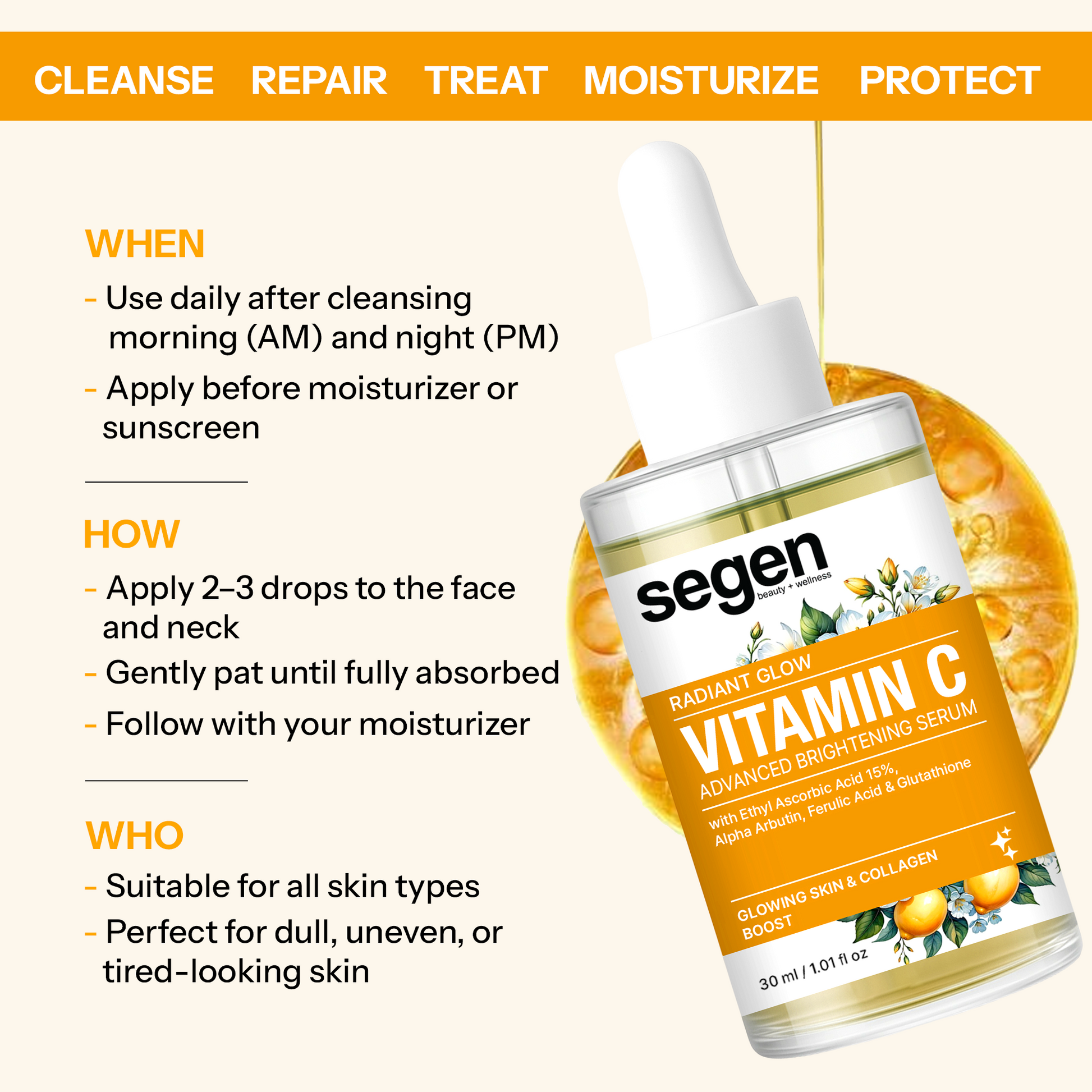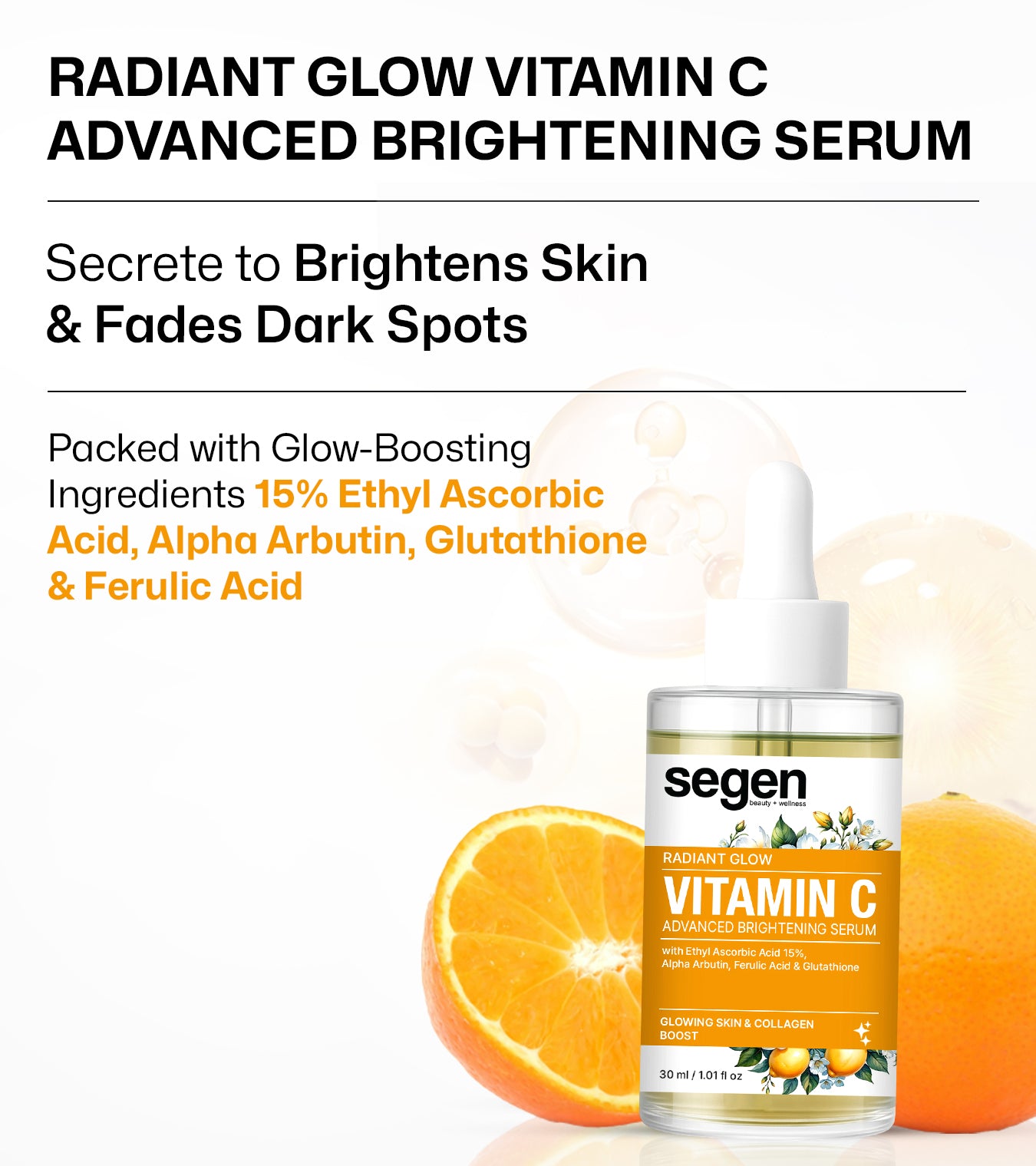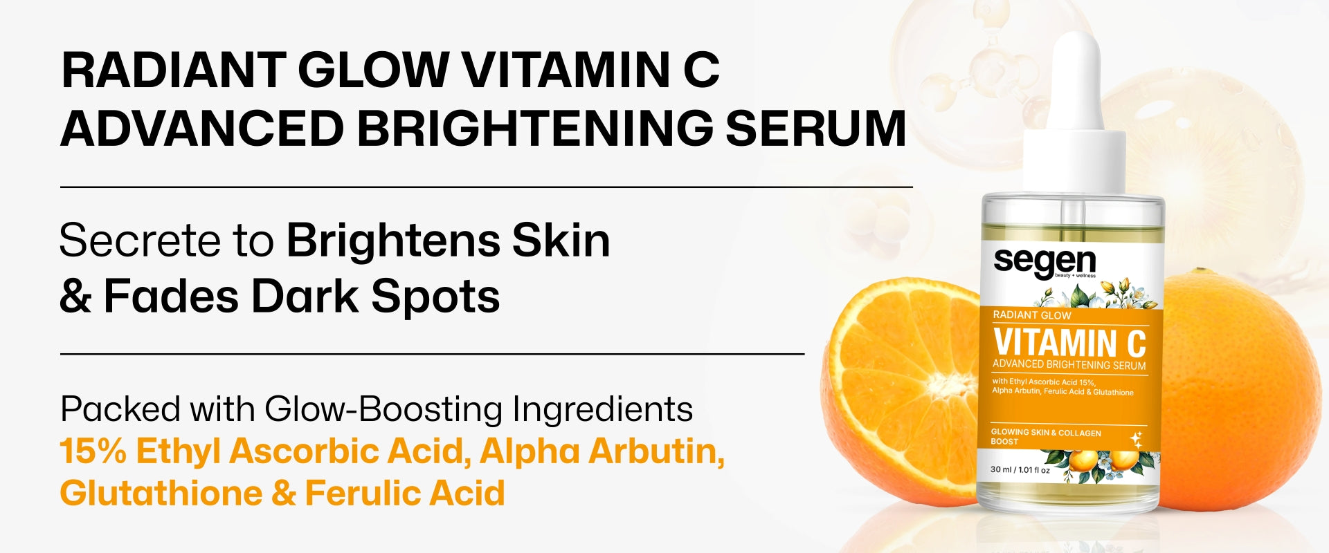 Segen Vitamin C 15% Brightening Serum with Alpha Arbutin, Ferulic Acid & Glutathione | Boosts Radiance, Collagen & Glow – 30ml