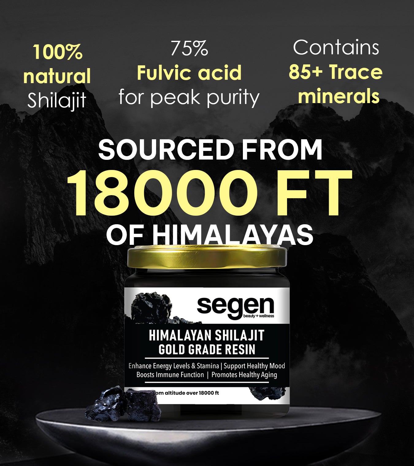 Experience the full potential of ancient Ayurvedic wellness with Segen Wellness Himalayan Shilajit Resin. This premium resin is extracted from high-altitude rocks in the Himalayas and undergoes meticulous purification to retain its natural potency.Each 20g jar is rich in fulvic acid, humic substances, and 85+ essential trace minerals that rejuvenate your body from the inside out.